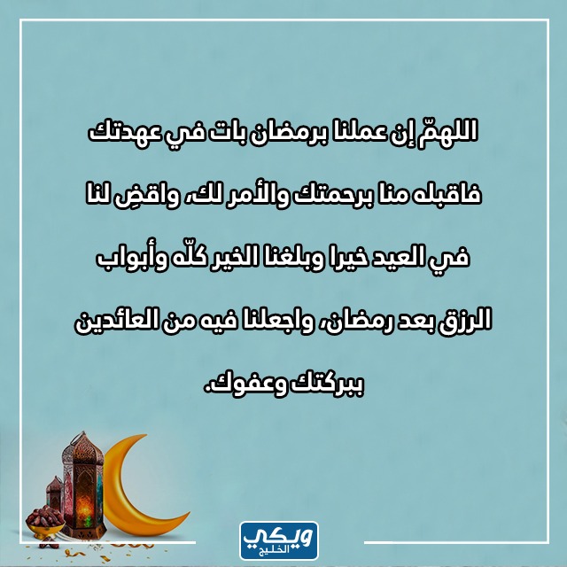 | الدعاء الثالث | اللهمّ إن عملنا برمضان بات في عهدتك فاقبله منا برحمتك والأمر لك، واقضِ لنا في العيد خيرا وبلغنا الخير كلّه وأبواب الرزق بعد رمضان، واجعلنا فيه من العائدين ببركتك وعفوك. |