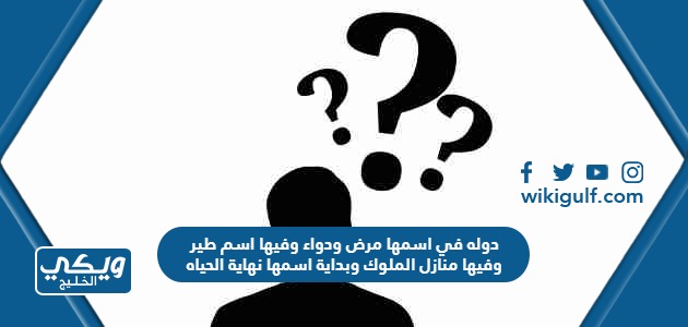 دوله في اسمها مرض ودواء وفيها اسم طير وفيها منازل الملوك وبداية اسمها نهايّة الحياه، إذ تتنوع الألغاز في موضوعاتها وصعوبتها، فقد تكون بعض الأسئلة رياضية ومنطقية، وأخرى ألغاز وأسئلة ثقافية وغيرها، ومن خلال موقع ويكي الخليج سيتم التعرف على حل لغز دَوله في اسمِها مرَض ودَواء وفِيها اسمُ طيرٍ وفِيها منازلُ الملوكِ وبدايةُ اسمِها نهايةُ الحياة.