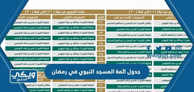 جدول ائمة المسجد النبوي في رمضان 1444 متضمناً أسماء الأئمة الأفاضل ممن سيقومون بإمامة صلاتي التراويح والتهجّد خلال شهر رمضان المبارك، حيثُ تُعلن وكالة شؤون المسجد النبويّ عن جدّول الصلوات خلال الثلاثين ليلة المباركة من ليالي شهر رمضان المبارك، والتي يُرفقها موقع ويكي الخليج في السطور التالية تفصيلاً.