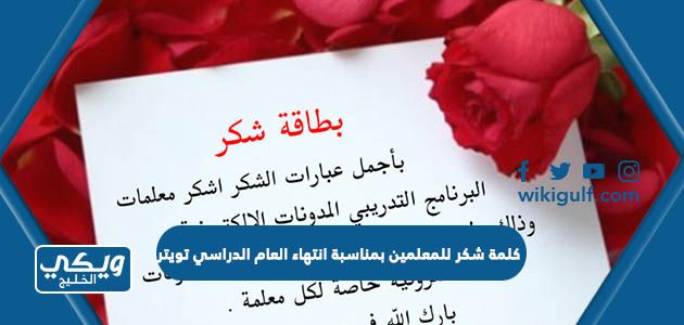 كلمة شكر للمعلمين بمناسبة انتهاء العام الدراسي تويتر من خيرة الكلام المتداول والمخصص للمعلمين، كشكر وتعظيم على ما بذلوه من مجهود طيلة العام الدراسي في سبيل بناء شخصية الطالب وتوجيه فكره وأدائه إلى مقومات المستقبل الزاهر، أطيب الكلام وأروعه مما يناسب حفلات التخرج بنهاية العام وما في حكمها من سواها نجدها في صلب المقال الآتي عبر موقع ويكي الخليج، التي سيتم عرضها بملفات مختلفة الصيغ تناسب كافة الاستخدامات.
